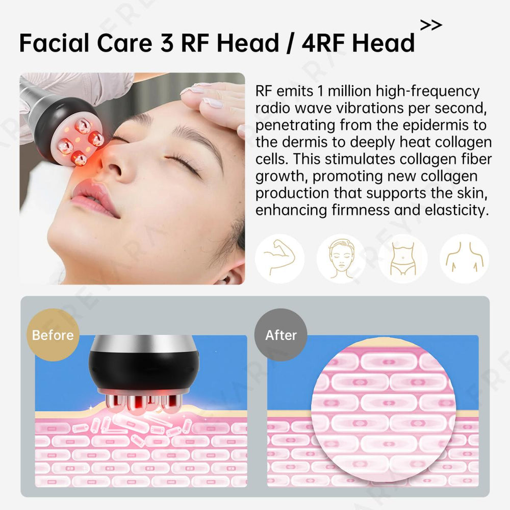(1) Applicare uniformemente il prodotto sul viso, utilizzare la testina RF per il viso, operare dal basso verso l'alto per sollevare il viso, rendere la pelle in uno stato teso, si consiglia di utilizzare per 5 minuti;