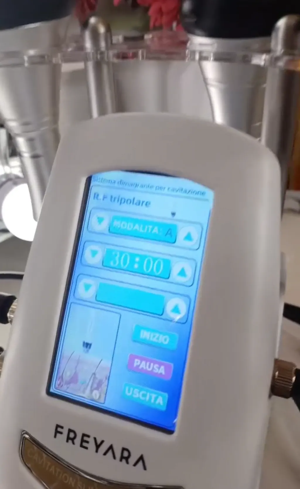 Salve, non riesco a capire se ci sono dei miglioramenti. La cavitazione la faccio per 20 minuti a zona, modalità D. Per la potenza dipende dalla zona che tratto. La RF multipolare la utilizzo in modo che la temperatura della pelle sia sui 42° per attivare il collagene.