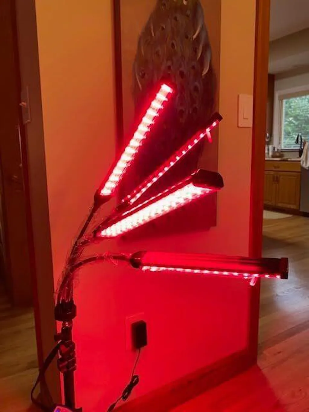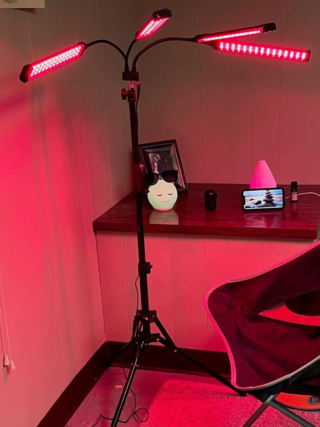Il supporto è progettato in modo sorprendentemente semplice: non ho nemmeno avuto bisogno di leggere le istruzioni per montarlo e metterlo in funzione in pochi minuti. Apprezzo molto anche la flessibilità delle quattro fonti luminose, che si possono regolare facilmente. È quasi come una doccia di luce rossa… davvero fantastico.