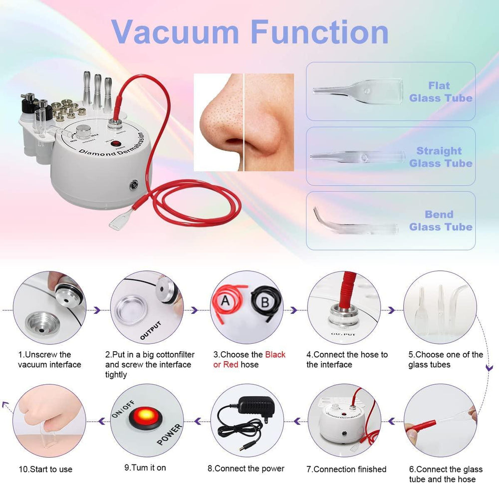 【Apparecchio di bellezza 3 in 1】Oltre al peeling microcristallino con diamante, questa macchina dispone anche di una funzione di aspirazione e una funzione spray. 3 ugelli in vetro per l’aspirazione e 2 bottiglie speciali per lo spray per trattare diversi problemi della pelle.