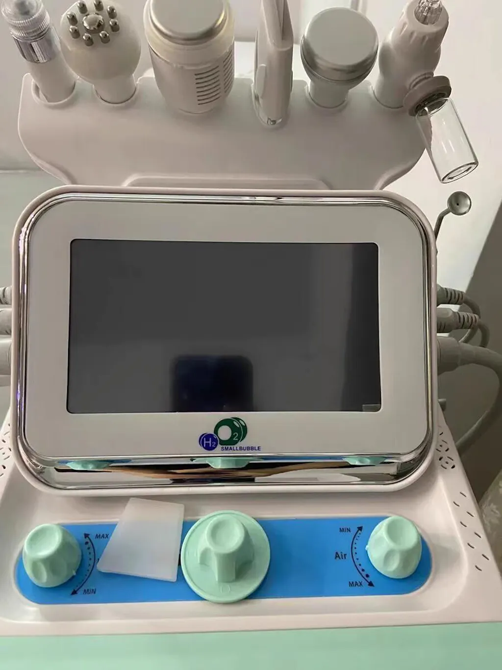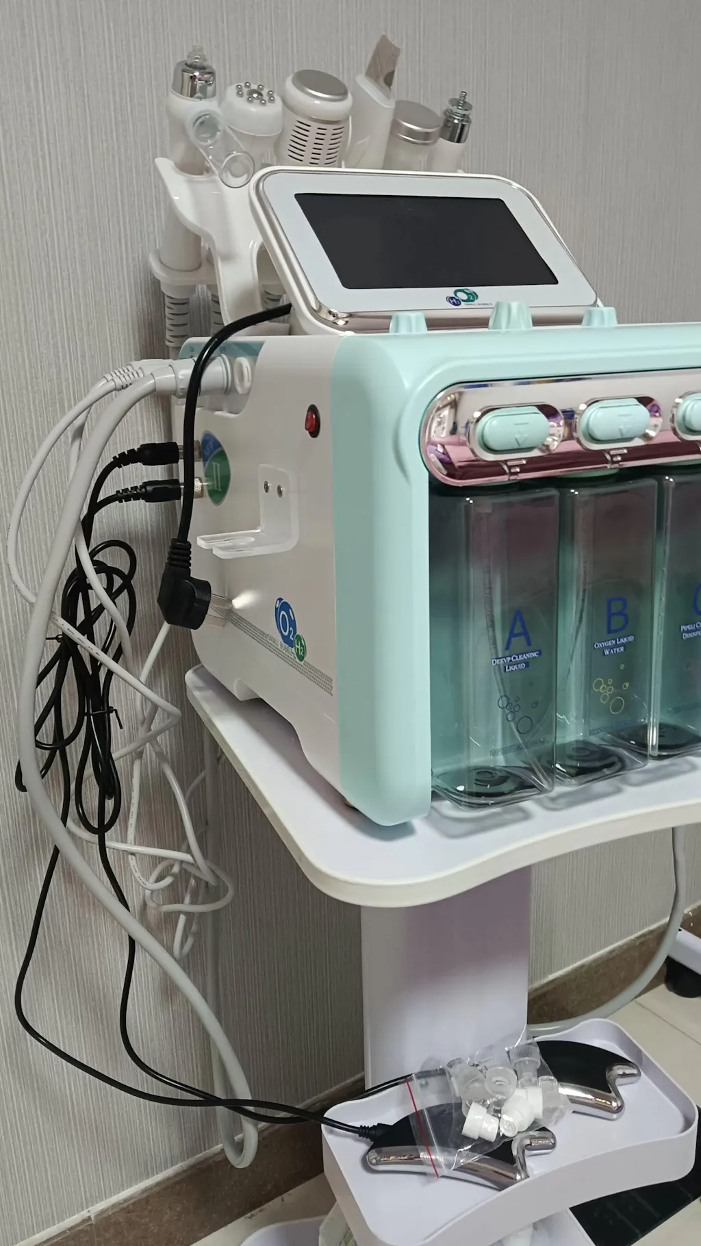 Modalità Bolle di Idrogeno e Ossigeno: Versare la soluzione nutriente nella bottiglia A o aggiungere acqua purificata nella bottiglia B. Avviare l'icona ABSORB e regolare le ore di lavoro, il rilascio dell'acqua, il vuoto e i cicli di aria calda. Eseguire test funzionali sulla testina per garantire che il vuoto, il rilascio dell'acqua e la temperatura siano correttamente impostati. Utilizzare la punta verticale del penna per assorbire la pelle.