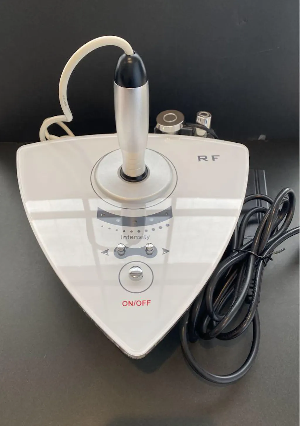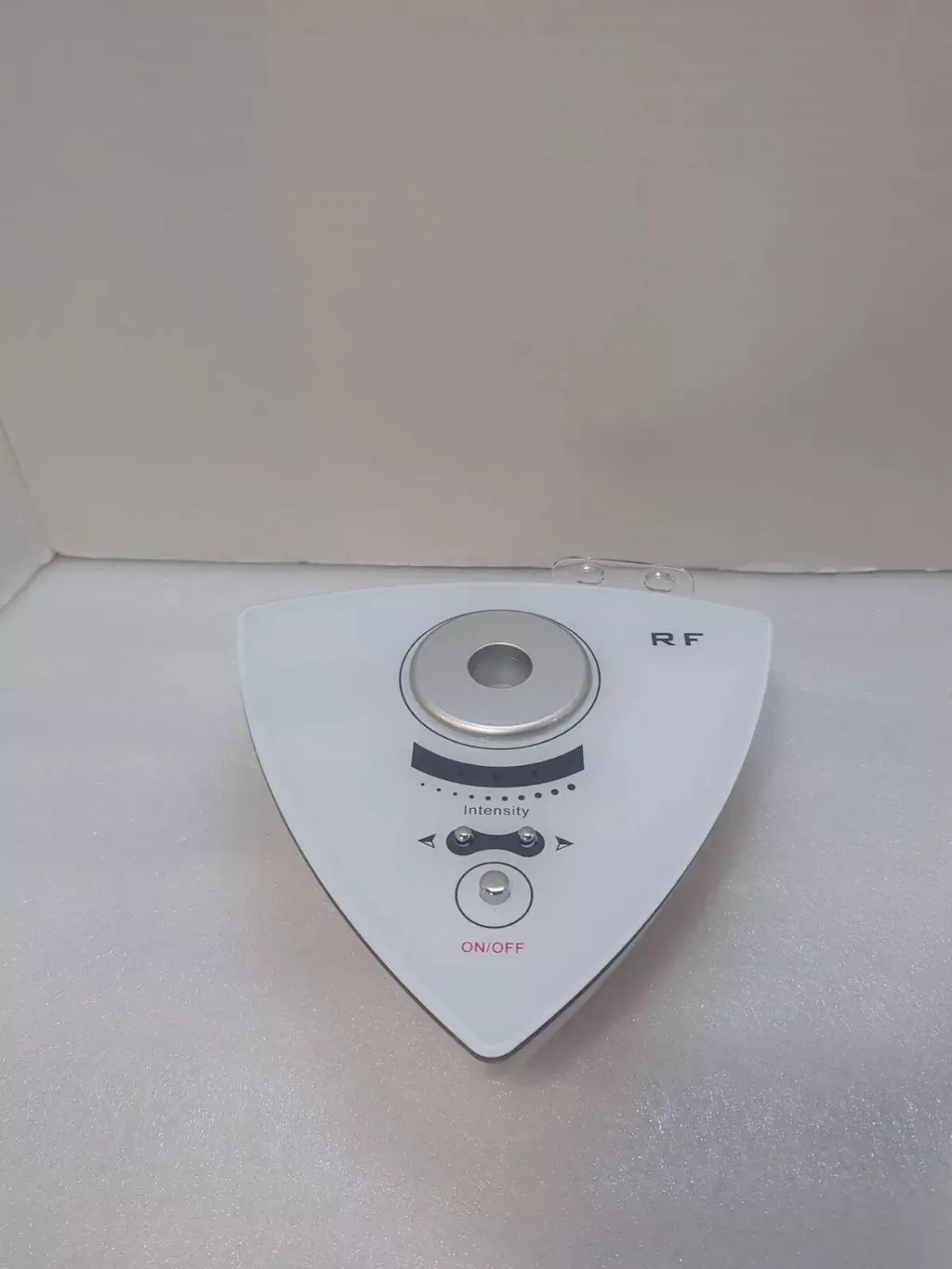 Tenere premuto il tasto ON/OFF per 3 secondi, la quinta spia lampeggia 6 volte: entra nell'intensità RF della sonda esapolare (corpo). Per tornare alla tripolare (viso), tenere premuto ON/OFF 3 secondi: la terza spia lampeggia 6 volte.